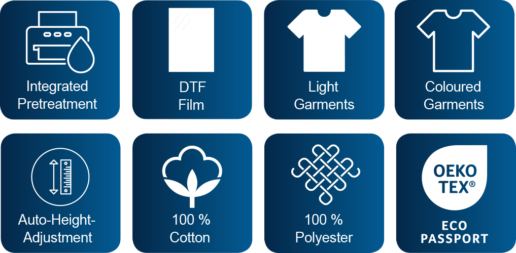 Print directly onto cotton and polyester! The built-in pretreatment technology and the optimised enhancer give you maximum flexibility for your production.